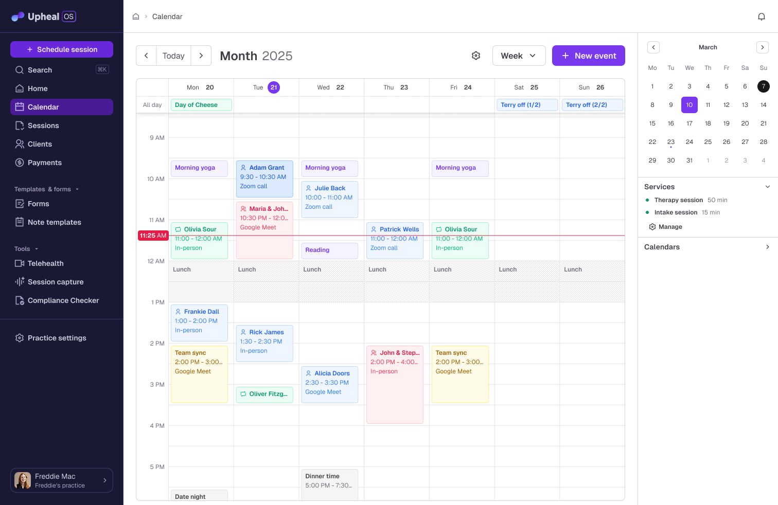 Upheal combines AI-powered clinical documentation with modern scheduling capabilities, representing next-generation software that understands therapy.