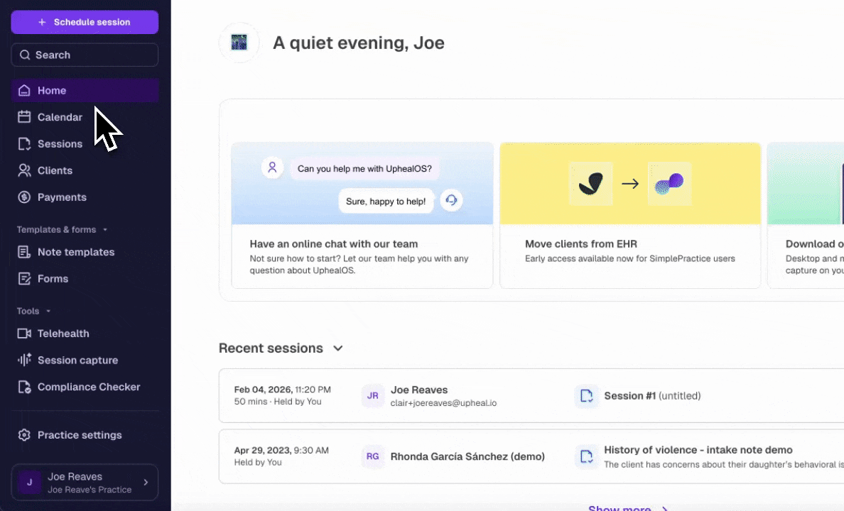 Use AI Assistant to prepare for sessions, spot patterns over time, and even during Upheal telehealth sessions, so key insights, context, and clinical tools are available while you’re talking with a client, without breaking focus.